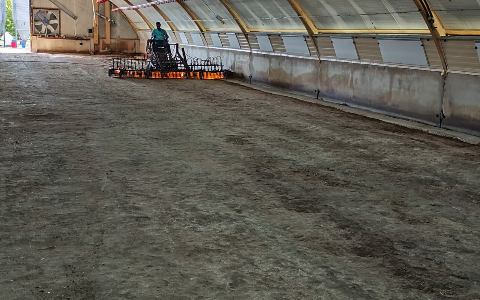 Currently, our machines can disinfect 4m wide strips on each pass, enabling us to work quickly (clay floors: 500 m²/h – concrete floors from 800 to 1200 m²/h depending on the maximum temperature the slab can take).